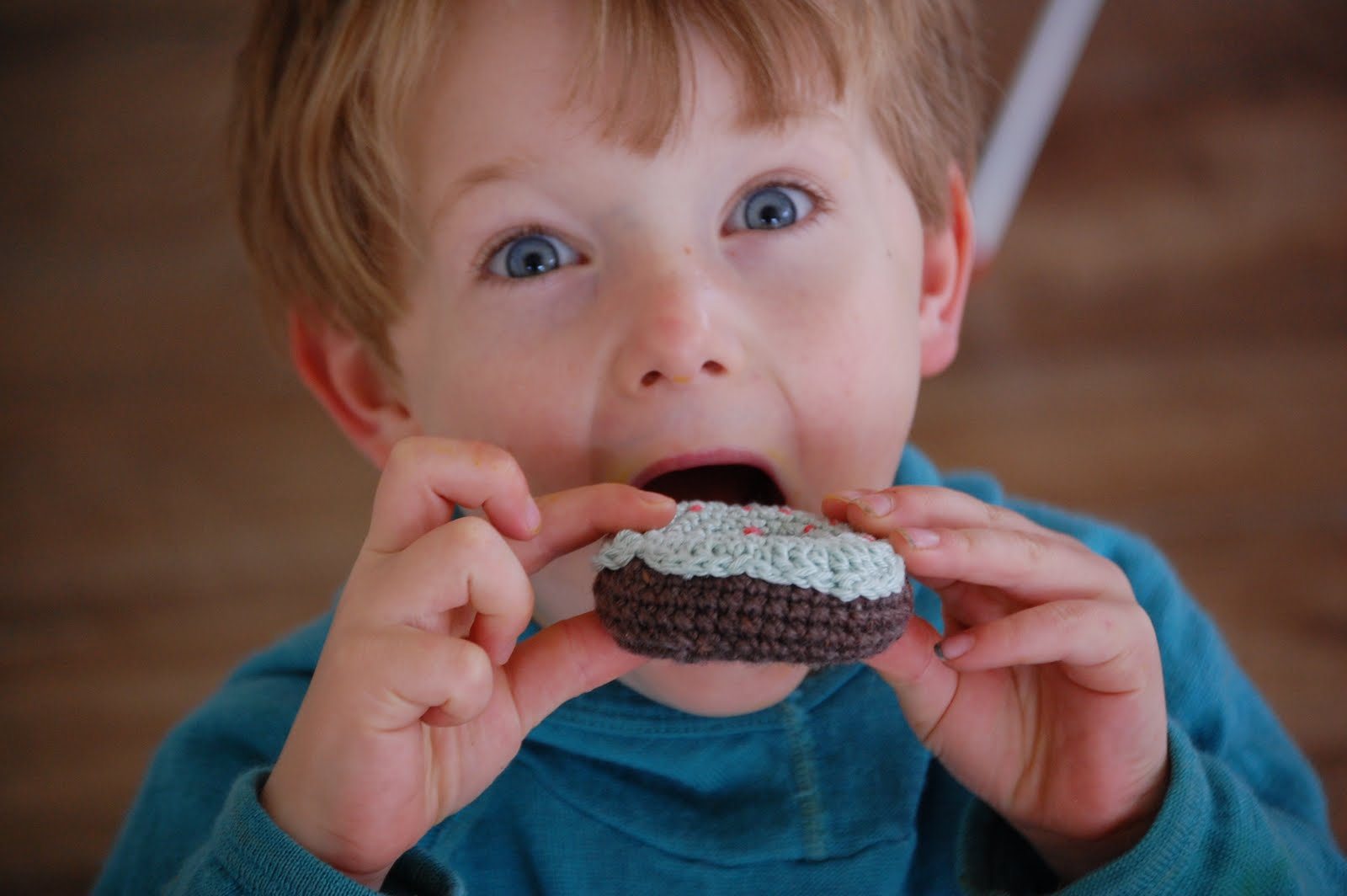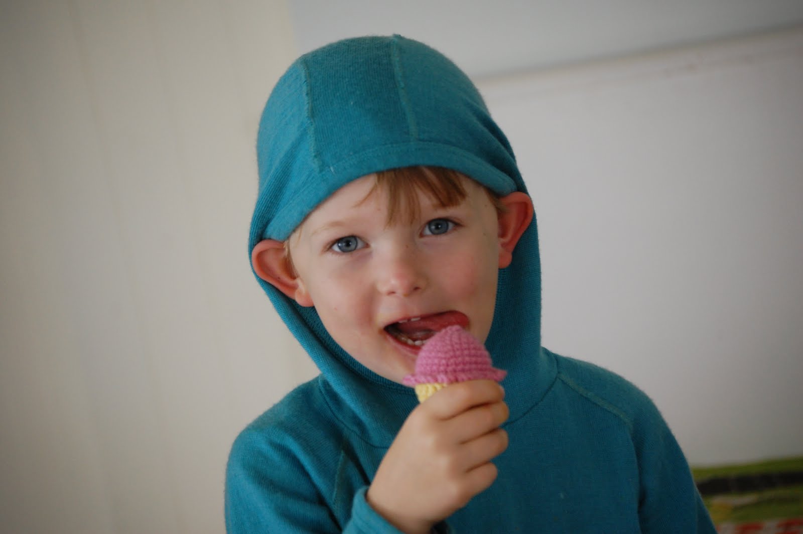 Here is Hugo - or should I say Chinky the pixie from Enid Blyton's 'Wishing Chair' books. Jonno makes him put up his hood and pop out his ears. We did have fun with this little fellow today. (And he had an enormous rest so it wasn't all photo shoots and crocheted food).