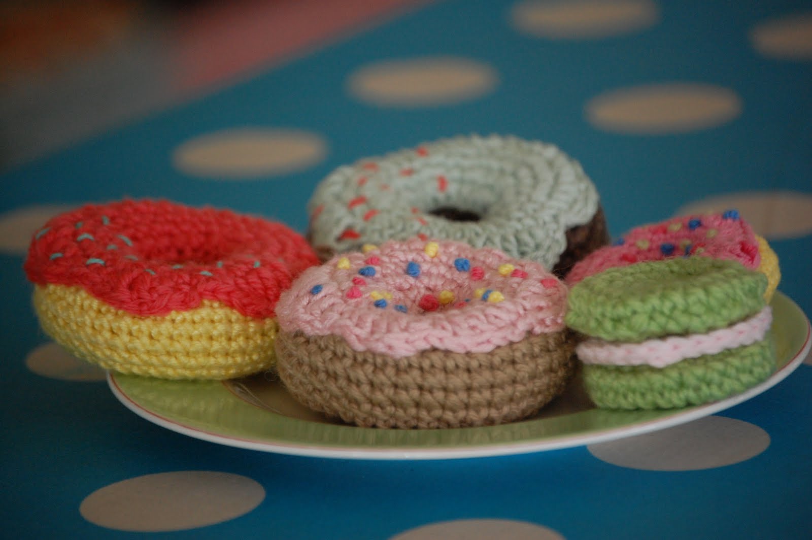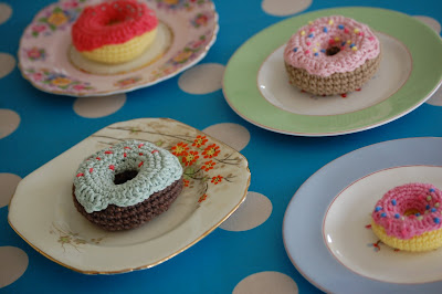 Oh my giddy aunt, I have just found the best free pattern for donuts ever! I couldn't get my head round the way they were made ('scuse the pun) and was overjoyed when I found a pattern that was simple and beautiful.