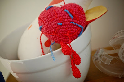 I took out my crochet hook and gave Jonno my heart... albeit with veins and arteries and still dripping with blood. Jonno's such a good sport that he's still wearing it. The boys thought it was hilarious.