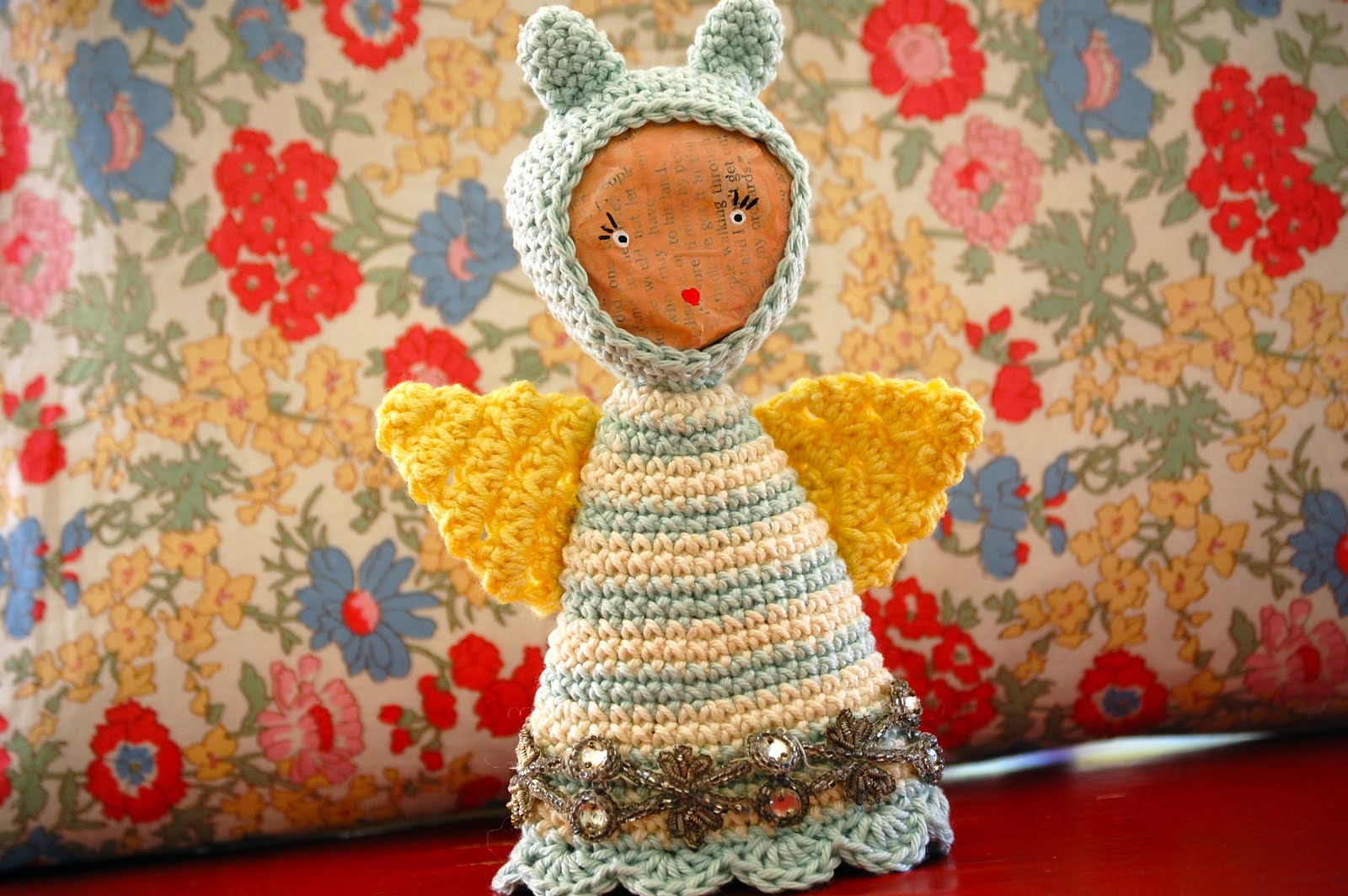 Apart from the garland/headband, this is the other project I have been working on for our school's silent auction. An angel-bunny-Christmas-tree-topper in the tradition of Julie Arkell combining crochet (or knitting) with papier mache (google her). I left the body hollow so that she can sit proudly on top of the tree but will also attach a little loop to her head so she can also dangle from a branch if need be.